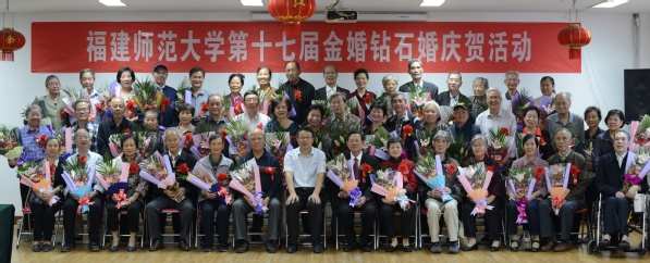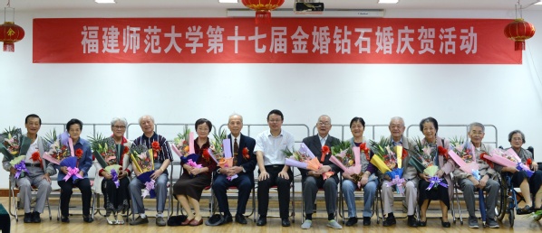 受林和平书记和王长平校长的委托,潘玉腾副书记首先代表校党委、校行政和全体师生员工,向金婚、钻石婚伉俪们表示热烈的祝贺和衷心的祝福。潘玉腾说,五、六十年前,诸位伉俪怀着共同的理想信念、相同的生活追求,志同道合地走在一起,结为相依相伴的人生伴侣,风雨同舟、携手并进,同甘共苦、相濡以沫,诠释了“执子之手,与子偕老”的深刻内涵,为国、为校、为家奉献了青春年华和聪明才智,创造了一个又一个辉煌,不仅为社会的进步、为学校的发展作出了重要贡献,也为建设婚姻美满、幸福和睦的家庭树立了光辉的榜样,赢得了全校师生员工的崇敬和爱戴。尊老敬老是中华民族的传统美德,更是一种社会责任,学校始终高度重视离退休工作,始终把老同志放在心上,努力服务好、照顾好老同志,希望通过举行金婚、钻石婚庆贺活动,进一步弘扬中华民族尊老爱老、养老助老的优良传统,引导年轻一辈建立代际和谐、老少共融的美满家庭,树立良好的校园风气,推动社会的文明与进步。潘玉腾希望老同志们今后继续关心、支持学校的建设与发展,为我们加快推进高水平大学建设多提宝贵意见。