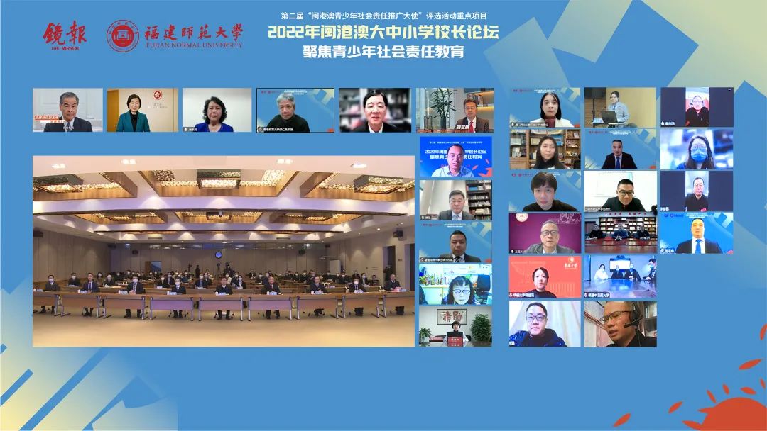 本次论坛是第二届“闽港澳青少年社会责任推广大使”评选活动的重点项目。开幕式后,香港教育大学校长张仁良,福建中医药大学校长李灿东,福建农林大学副校长郑宝东,香港理工大学协理副校长石丹理,香港教育工作者联会会长、香港岭南大学协理副校长刘智鹏,J9·九游会「中国」官方网站副校长陈庆华,华侨大学副校长王建华,香港珠海学院校长陈致,福州外语外贸学院党委副书记、副校长徐国立,香港教育工作者联会副会长、香港培侨中学校长伍焕杰,厦门双十中学书记、校长欧阳玲,香港福建中学附属学校校长徐区懿华等闽港澳大中小学校长,围绕论坛主题“弘扬传统文化 坚持立德树人 共履社会责任”做主旨发言。近百位闽港澳校长通过线上线下方式参与论坛,交流在弘扬中华优秀传统文化和履行社会责任方面的理论研究和宝贵经验。通过研讨,有效增强了与会嘉宾对彼此的了解,形成了对青少年成长、闽港澳教育融合发展的一系列长远共识。