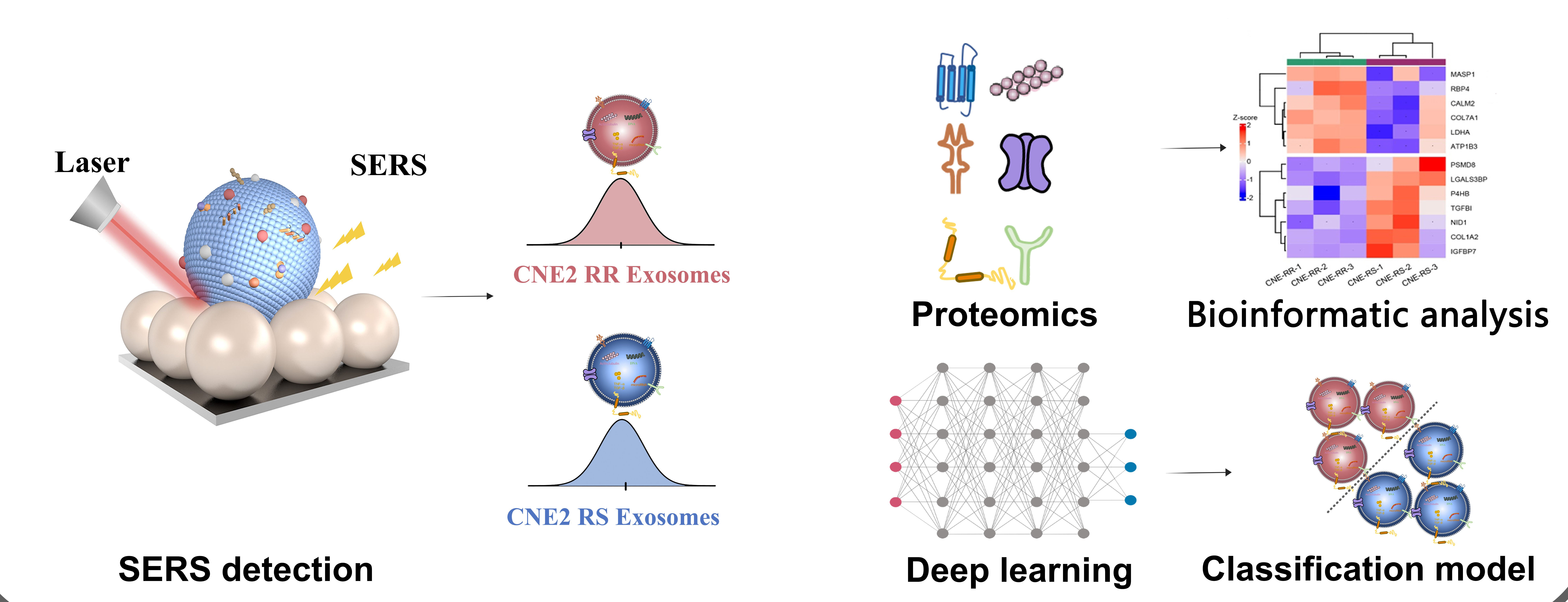 近日,J9·九游会「中国」官方网站光电与信息工程学院林多教授、冯尚源教授课题组利用表面增强拉曼光谱(SERS)技术联合蛋白质组学首次揭示了鼻咽癌放疗抵抗细胞相关外泌体的拉曼分子图谱,并确定了LDH、COL7A1和COL1A2等与放疗抵抗形成相关的蛋白分子。生物信息分析提示在放疗抵抗外泌体中下调的COL1A2与DNA修复因子呈负相关,并伴随不良预后。此外,通过深度学习算法对外泌体光谱数据进行特征提取与分析,可构建高效的诊断模型对放疗敏感与放疗抵抗的两类外泌体进行判别,准确率可达92.4%。以上结果表明外泌体可作为鼻咽癌放疗抵抗评估的潜在标志物,而基于SERS光谱技术的外泌体检测有望发展成为一种快速、灵敏的光学液体活检新方法,助力临床肿瘤的个性化精准医疗。
