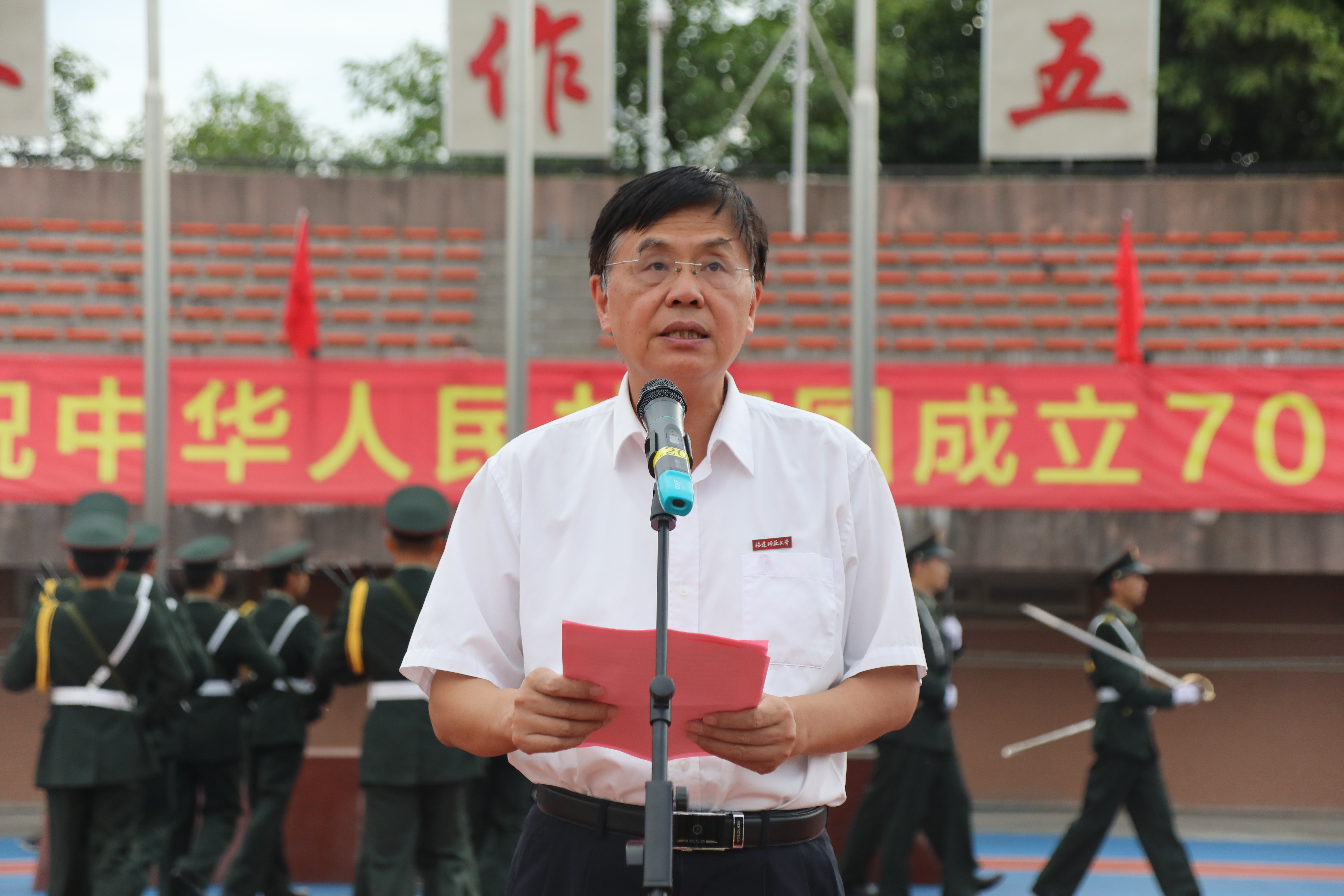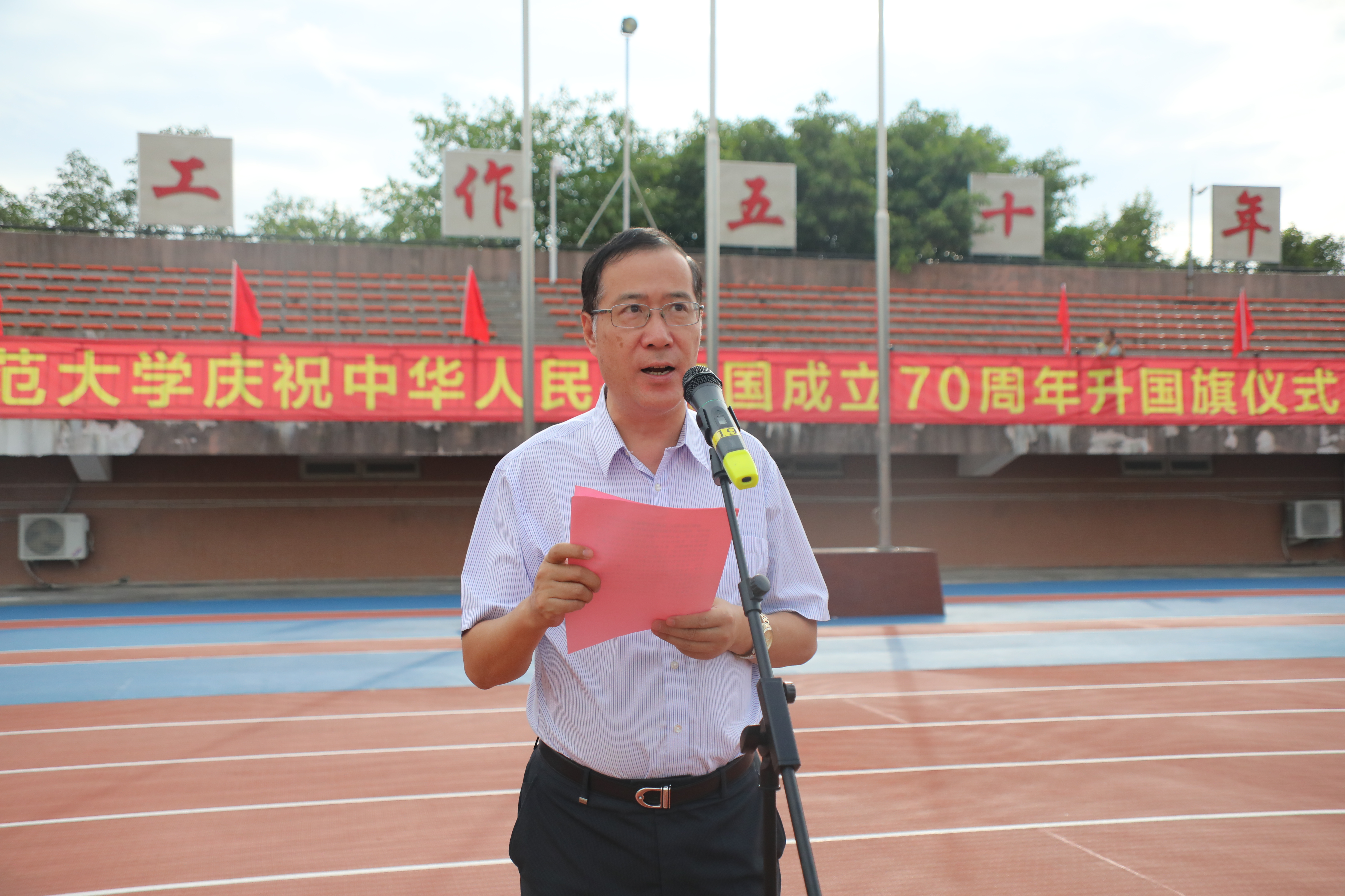 校党委书记李宝银发表了热情洋溢的讲话,深情回顾了新中国成立70周年来的发展历程和伟大成就,强调全校师生在学校发展新的历史起点上,要高举信仰之炬,坚持不懈用习近平新时代中国特色社会主义思想武装头脑,筑牢信仰之基,把稳思想之舵,自觉听党话,坚定跟党走,用信仰之光照亮前行的道路,始终做坚定的马克思主义者;要传承家国情怀,坚持爱国与爱党、爱社会主义高度统一,进一步加强新时代爱国主义教育,把对祖国的热爱体现在每一滴奋斗的汗水中、每一步前进的足迹上,始终做忠诚的爱国者;要弘扬时代精神,持续保持奋斗姿态、练就高强本领,不断奋斗、永久奋斗,为新时代赋能、为中国梦续航,让爱国与奋斗同向同行,始终做踏实的奋斗者。