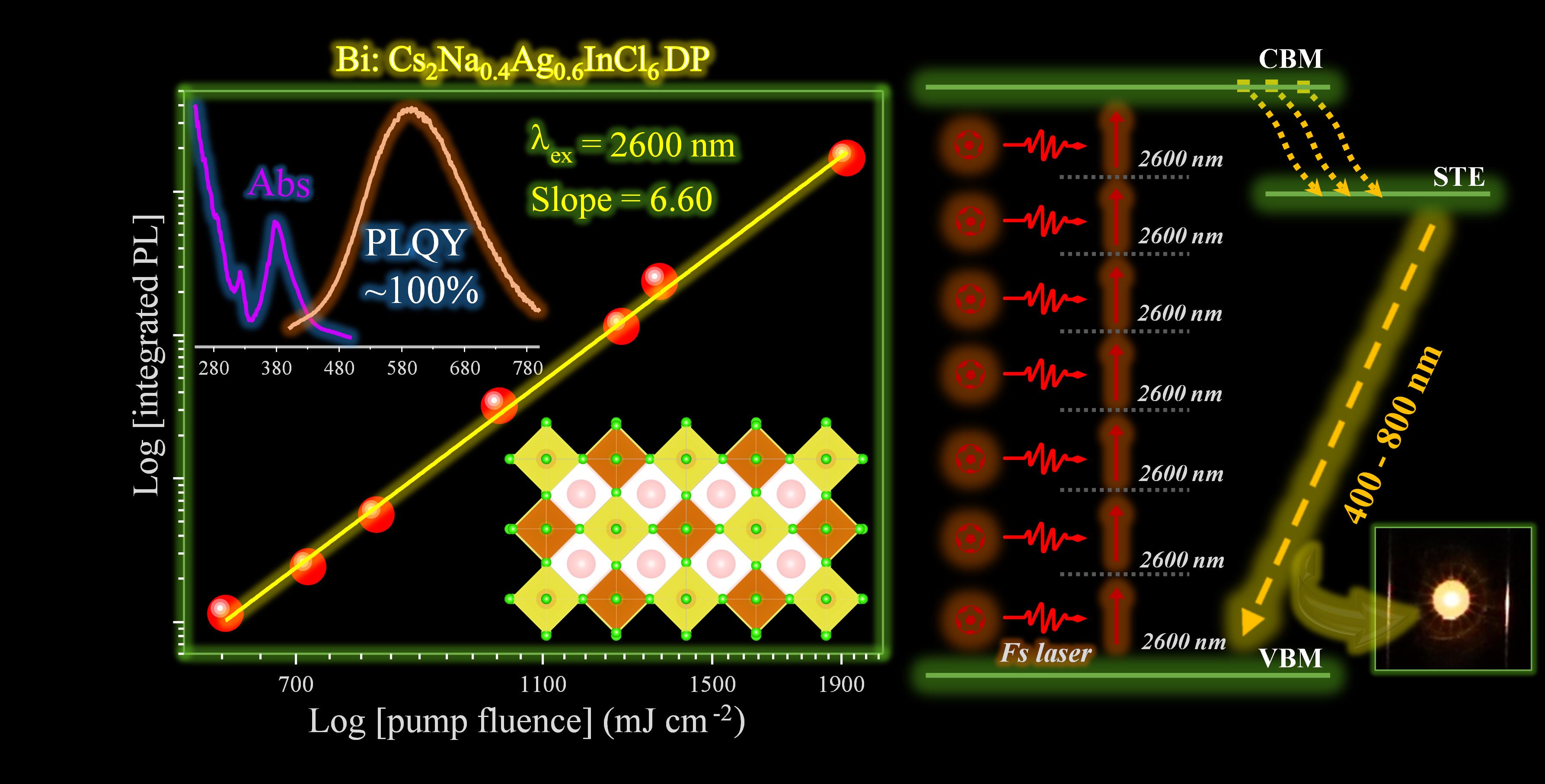 近日,J9·九游会「中国」官方网站陈大钦教授课题组联合中科院福建物质结构研究所陈学元研究员通过异价取代的方式制备了高稳定性、近100%发光效率的Cs2Na0.4Ag0.6In1-xBixCl6无铅双钙钛矿材料。密度泛函理论计算揭示了Na/Bi合金化对双钙钛矿光学吸收的影响,材料在800~2600nm的宽光谱范围内可被飞秒激光有效激发,并首次在无铅双钙钛矿中观察到的2-7光子非线性吸收现象。