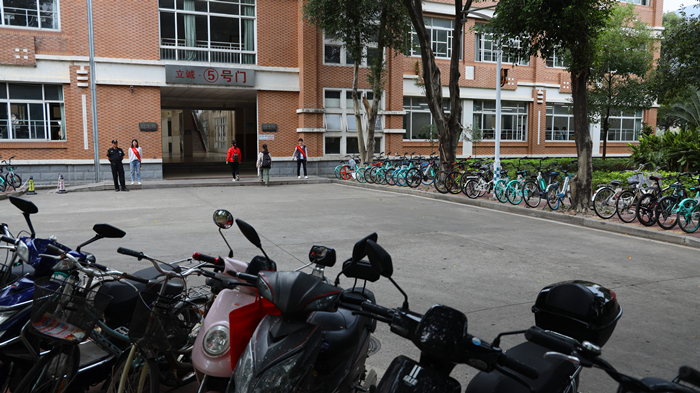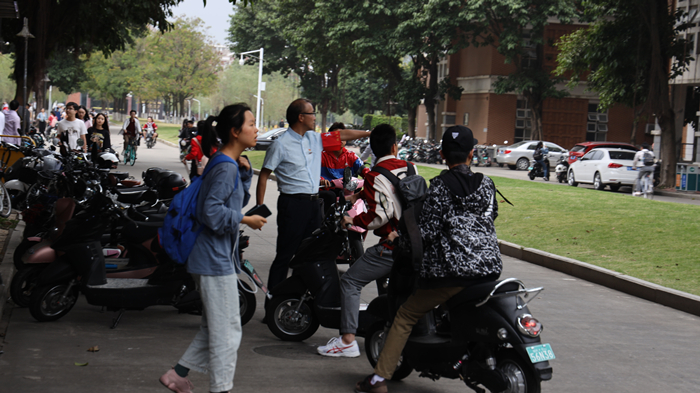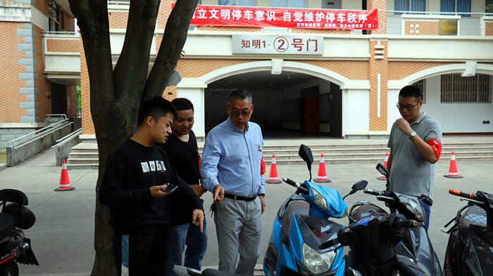 在旗山校区教学楼区域,志愿者们身体力行,将散落的各类车辆摆放整齐、停车入位,劝导师生规范停放车辆,引导师生做文明的骑行者,共同维护校园车辆的停放秩序。