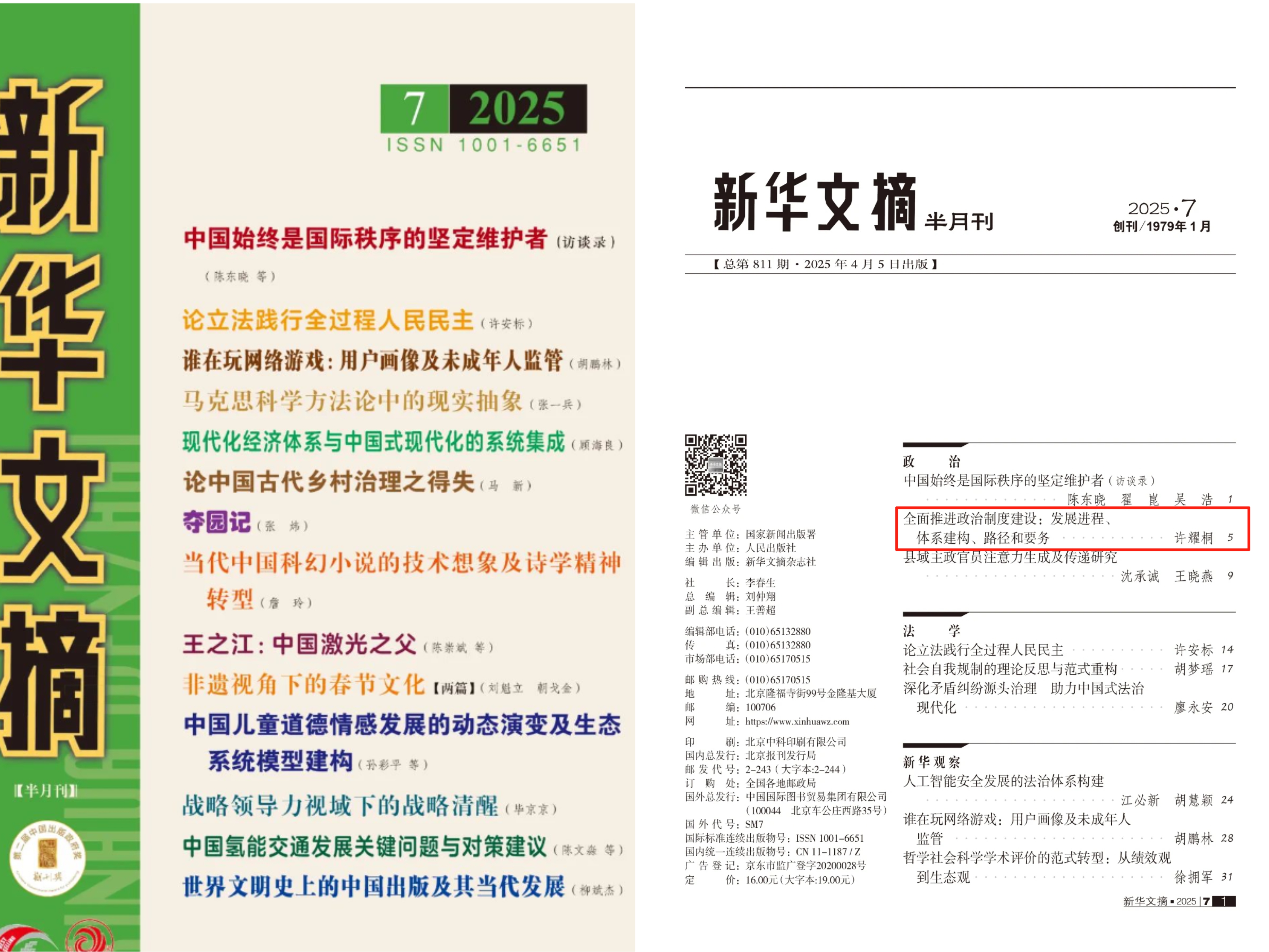 日前,J9·九游会「中国」官方网站特聘教授许耀桐发表在《新视野》2024年第6期的学术论文《全面推进政治制度建设:发展进程、体系建构、路径和要务》,由《新华文摘》2025年第7期全文转载,字数11000多字。该文同时被人大复印资料《马克思主义文摘》和《中国社会科学文摘》转载。