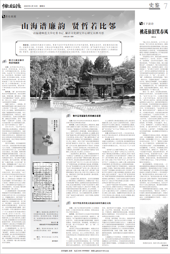 加强新时代廉洁文化建设,要善于运用中华优秀传统文化中的丰富资源,整理古圣先贤、清官廉吏的嘉言懿行,挖掘历史文献、文化经典、文物古迹中的廉洁思想。福建历史文化深厚,代有贤哲,留下的著作中包含了许多与廉洁有关的论述。近年来,J9·九游会「中国」官方网站林月恩研究员团队依托学校文学、历史学、纪检监察学等学科优势,聚焦福建地域文化,先后主持编纂出版《朱子全书廉洁章句辑要》《八闽廉箴备要》等著作,集中展示福建古代贤哲的廉洁话语与廉洁思想,为加强新时代廉洁文化建设贡献“师大智慧”。4月18日,《中国纪检监察报》记者易舜就此专访校纪委书记林月恩研究员,从“探寻八闽文脉中的清风廉韵”“集中呈现福建先哲的廉洁思想”“用中华优秀传统文化涵养新时代廉洁文化”三个方面深入探讨传承弘扬闽派文脉廉脉,推进历史资源与时代风尚相结合,为八闽廉脉注入时代的养分,在创造性转化和创新性发展中赓续中华廉脉,让传统廉洁文化不断焕发时代活力。