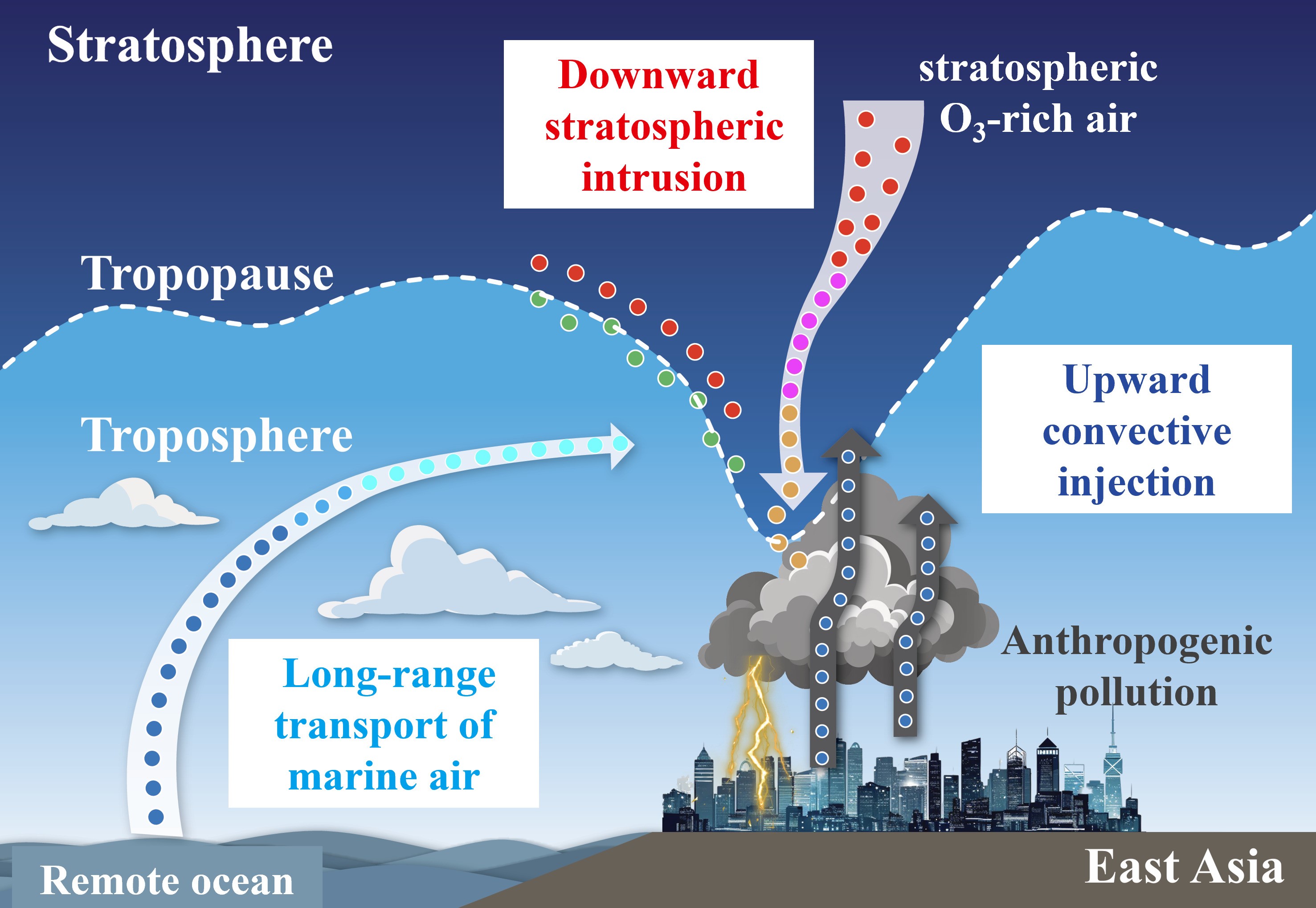 平流层和对流层的双向物质交换过程,对大气化学特性及云物理、辐射过程等具有重要作用。以往研究侧重于单向传输,如平流层空气下沉或者对流层空气向上输送,针对二者同时发生的研究还较少。无论何种情况,对流层顶区域是这些过程的必经之路,因而对流层顶化学结构(TCS)受到平流层-对流层交换(STE)的调控,其变化对气候演变有着重要影响;加上东亚地区排放强度大,STE活动频繁,不同来源的大气成分发生相互混合并改变TCS特征。