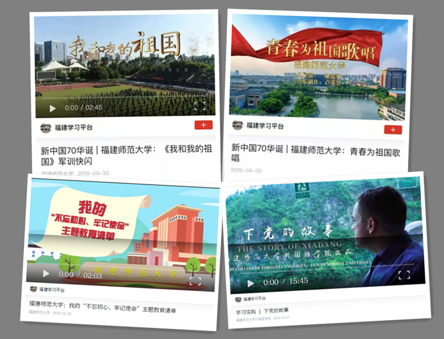 二是联系实际学。各学院、各部门按照“读原著、学原文、悟原理”的要求,立足工作实际,创新活动载体,推动新思想可感可知、入脑入心。校团委、外语学院等先后制作了原创动漫微视频《我的“不忘初心 牢记使命”主题教育清单》、原创英文专题片《学习实践--下党的故事》、视频《我和我的祖国》《我的未来》等,在学习强国平台上宣传展播,成为宣传习近平新时代中国特色社会主义思想的重要素材。马克思主义学院、数学与信息学院开通“红传航道”微信公众号,推出红色文化相关文章629篇(单篇阅读量最高达3.1万次)。“福师大小葵”每日推送由学校青年学生习近平新时代中国特色社会主义思想研习传播社出品的“学习日历”。“青马易战”开辟了“不忘初心、牢记使命” 等特色模块,参与学生党员3416人,答题数达551万。