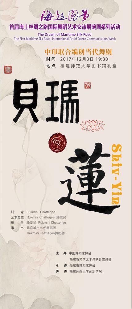 舞剧《贝玛•莲》(《Shiv-Yin》)由印度编导鲁克米尼•查特吉和中国著名舞蹈家滕爱民共同编创并表演。该作品通过印度古典舞蹈和中国当代舞蹈的共同演绎,诠释穿越爱、恨、情、仇与物我交融的人类情感,在两种文化中探索男女、阴阳的关系,寻求两种文明的共通之处。这段中印舞蹈文化交流与碰撞的作品,秉承着对本民族文化的坚守和对双方舞蹈艺术的认可,融汇了当代舞蹈与传统文化的深厚内涵,寄托了两位舞蹈家对爱情的道白与诉说。 “我欲与君相知,长命无绝衰;山无陵,江水为竭;冬雷震震,夏雨雪;天地合,乃敢与君绝……”。舞蹈是跨越了时空的交流,是赋予了爱情的灵魂,是蕴藏了文化的身体,两位舞蹈家将这种信仰流注在两族舞者的身体与精神之中。