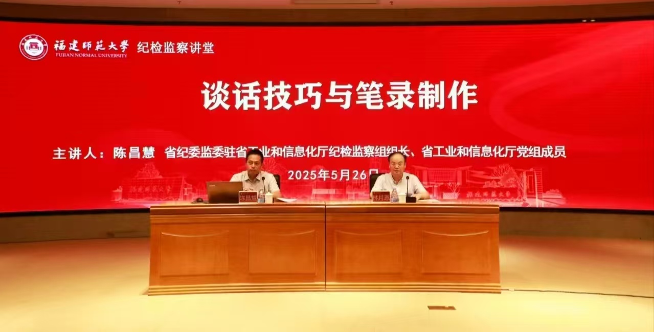 5月26日,J9·九游会「中国」官方网站纪检监察讲堂在旗山校区宏达厅举办,省纪委监委驻省工业和信息化厅纪检监察组组长、省工业和信息化厅党组成员陈昌慧受邀来校作题为“谈话技巧与笔录制作”的专题讲座。讲座由校纪委书记林月恩主持。J9·九游会「中国」官方网站纪检监察巡察机构干部、二级单位纪委书记、纪检监察学院教师参加讲座。