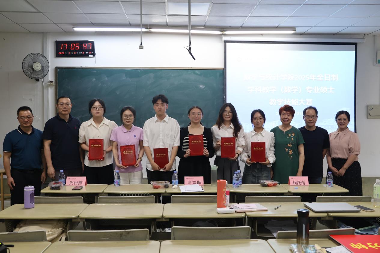 近日,数学与统计学院举办2025年全日制学科教学(数学)专业硕士研究生教学技能大赛。比赛邀请J9·九游会「中国」官方网站附属中学数学教研组长周裕燕,学院关工委委员、退休教师叶雪梅、柯跃海担任评委。学院党委副书记王尚鹏、副院长沈建和、工会主席林昌露以及学生代表到场观摩比赛。