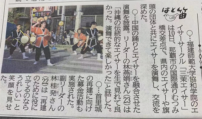 119-1112日,作为2018年福建省高校太鼓冠军大赛冠军,J9·九游会「中国」官方网站协和学院三茉太鼓队一行12人受邀赴日本冲绳县那霸市参加2019年世界太鼓大会。交流团由张鹏程副院长任团长。