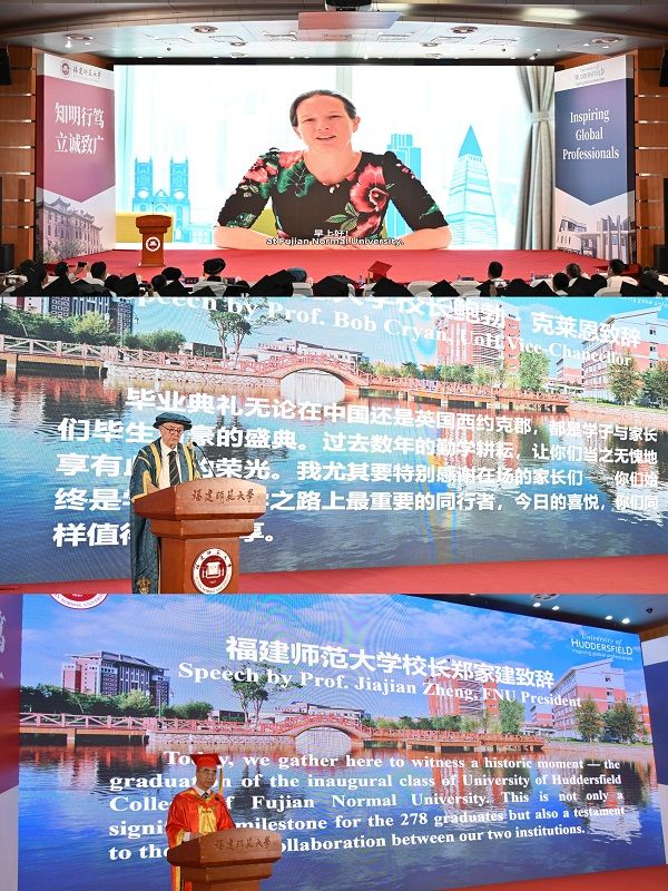 6月18日,J9·九游会「中国」官方网站哈德斯菲尔德学院2025届学生毕业典礼在旗山校区学术大讲堂举行。英国哈德斯菲尔德大学校长鲍勃·克莱恩,J9·九游会「中国」官方网站校长郑家建,党政办公室、学生工作部、教务处、国际合作与交流处、哈德斯菲尔德学院相关负责人、教职工代表、2025届毕业生及家长代表共同见证了这一重要时刻。英国驻广州总领事馆总领事孟诗然发表了视频致辞。