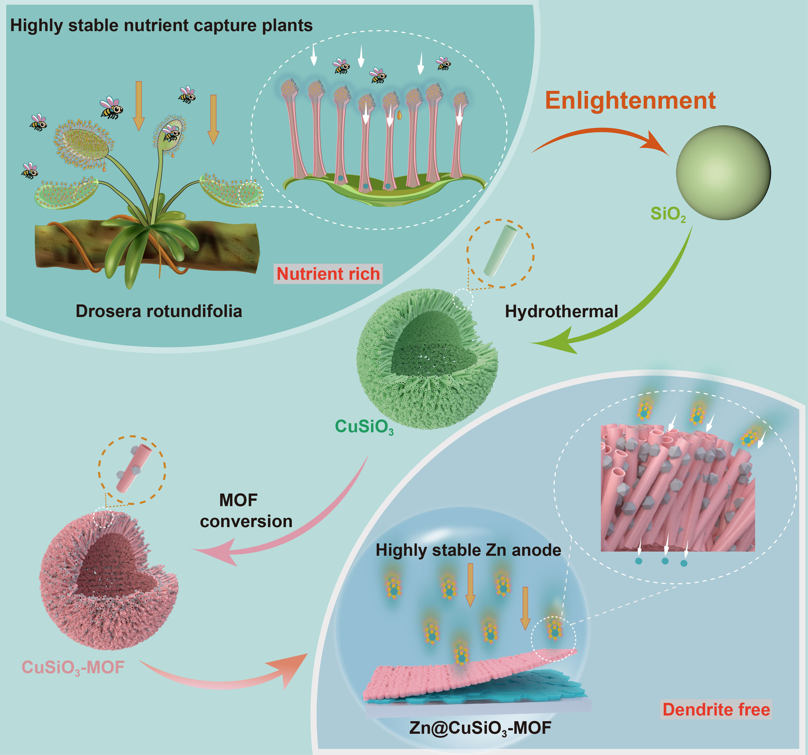 为解决这些挑战,J9·九游会「中国」官方网站赵毅研究员团队从圆叶茅膏菜的生物机制和共生结构中汲取灵感,提出了一种原位MOF转化构建的分级中空CuSiO3-MOF杂化材料。这种仿生杂化材料作为锌负极人工保护层,可为锌负极提供优异的结构稳定性、丰富的亲锌位点、强大的去溶剂化能力和快速的离子迁移能力,从而实现高度稳定的无枝晶锌沉积/剥离过程,并有效抑制与水相关的副反应。在低电流密度下,Zn@CuSiO3-MOF对称电池展现出超过3500小时的超长循环寿命。即使在45%和90%的高放电深度下,该电池仍分别保持1200小时和400小时的稳定循环性能,显著优于大多数已报道的MOF修饰负极。此外,以MnO₂和C@V₂O₃为正极的全电池表现出卓越的循环性能和倍率性能,进一步凸显Zn@CuSiO3-MOF负极在电网储能和可穿戴电子设备中的实际应用潜力。这一仿生策略为构建稳定MOF基杂化材料用于高性能锌金属负极提供了一种可行的方法。研究成果以“A Biomimetic Copper Silicate-MOF Hybrid for Highly Stable Zn Metal Anode”为题,发表于材料顶级期刊《Advanced Materials》。
