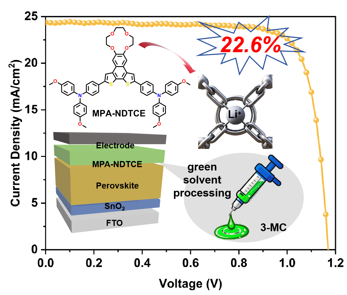 针对上述问题,J9·九游会「中国」官方网站海峡柔性电子(未来科技)学院王漾教授、安明伟副教授以及中科院福建物质结构研究所高鹏研究员设计了一种含有冠醚结构的空穴传输材料MPA-NDTCE,通过冠醚与锂离子之间较强的络合作用可以有效抑制锂盐聚集与锂离子的迁移,从而提升空穴传输层的形貌稳定性。值得注意的是,冠醚侧链的高极性赋予MPA-NDTCE在绿色溶剂(如3-甲基环己酮)中优异的溶解性和成膜性,从而避免了传统卤化溶剂(如氯苯)的使用。基于该新型空穴传输材料的钙钛矿太阳能电池最终实现了22.6%的最大能量转换效率,展现了其在高性能与环保加工协同优化方面的潜力。该项工作以“Design of Ionic Lock Structure for tBP-Free and Green-Solvent Processed Hole Transporter in Perovskite Solar Cells”为题发表在期刊ACS Sustainable Chemistry & Engineering上。