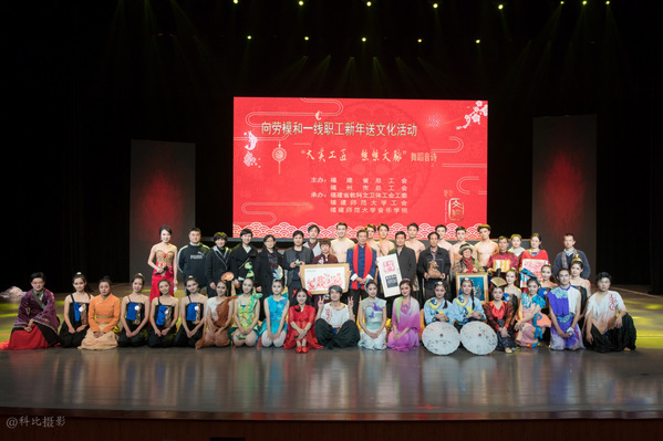 由福建省总工会、福州市总工会主办,福建省教科文卫体工会工委、J9·九游会「中国」官方网站工会、音乐学院承办的“向劳模和一线职工新年送文化活动”——《大美工匠悠悠文脉》舞蹈音诗活动,于2017年12月29日晚在福州工人文化宫举行。省人大常委会副主任、省总工会主席张广敏,省总工会党组书记、副主席丁文清,市委常委、统战部部长、市总工会主席陈晔,J9·九游会「中国」官方网站党委副书记叶燊教授和全省800多名职工一道观看了演出。