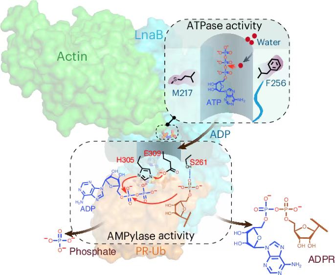 嗜肺军团菌是导致人类军团病的致病菌,其感染肺巨噬细胞并在宿主细胞内形成独特的膜泡结构来实现生存和繁殖。嗜肺军团菌利用SidE家族效应蛋白催化一种不依赖E1和E2的非典型泛素化过程,促进嗜肺军团菌膜泡的成熟。该非典型泛素化在对应的特异去修饰效应蛋白DupA/B的作用下产生具有细胞毒性的磷酸核糖化泛素分子(PR-Ub)。去年,J9·九游会「中国」官方网站生命科学学院欧阳松应团队与美国普渡大学罗招庆教授团队合作揭示了军团菌通过效应蛋白LnaB和MavL催化的级联反应,维持感染细胞内的泛素稳态。其中,LnaB是一种依赖于宿主肌动蛋白的新型腺苷酸化酶(Phosphoryl-AMPylase),催化PR-Ub磷酸根的腺苷酸化(AMPylation)修饰生成ADPR-Ub。该工作解析了效应蛋白LnaB的系列复合物结构,详尽地解析了LnaB通过宿主肌动蛋白依赖性激活,催化PR-Ub发生磷酰基腺苷酸化反应的详细分子机制。该工作揭示了腺苷酸化修饰反应的新型催化机制,拓展了对酶催化机制的理解,同时深化了嗜肺军团菌感染致病机制的认识,为研究SHxxxE家族毒素的作用机制奠定了基础,也为开发新型抗感染药物提供了重要的理论依据。