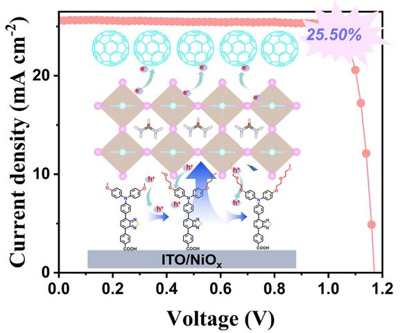 自组装分子(SAMs)被广泛用作倒置钙钛矿太阳能电池(PSCs)中氧化镍(NiOx)的界面改性层。然而,SAMs对钙钛矿结晶生长及钙钛矿上界面能级调控的影响较少受到关注。