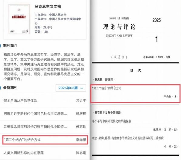 近日,《理论与评论》2025年第1期刊发的《“第二个结合”的结合方式》一文被人大复印报刊资料(《马克思主义文摘》2025年第3期)全文转载;《邓小平与中国式现代化的早期探索》一文获《新华文摘》2025年第14期论点摘编,展现了《理论与评论》在办刊质量上的持续进步。(马克思主义学院)