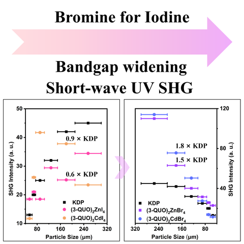全固态激光器的频率转换技术亟需高性能短波紫外(λ < 300 nm)非线性光学(NLO)晶体,但现有材料难以同时满足强二次谐波(SHG)响应、宽带隙、适中双折射率(Δn = 0.05-0.10@546 nm)及相位匹配能力。针对这一挑战,J9·九游会「中国」官方网站化学与材料学院陈瑾副教授和杜克钊教授团队创新性提出卤素取代策略,成功设计出兼具短波紫外相位匹配与强SHG响应的新型有机-金属卤化物(OIMHs)晶体。