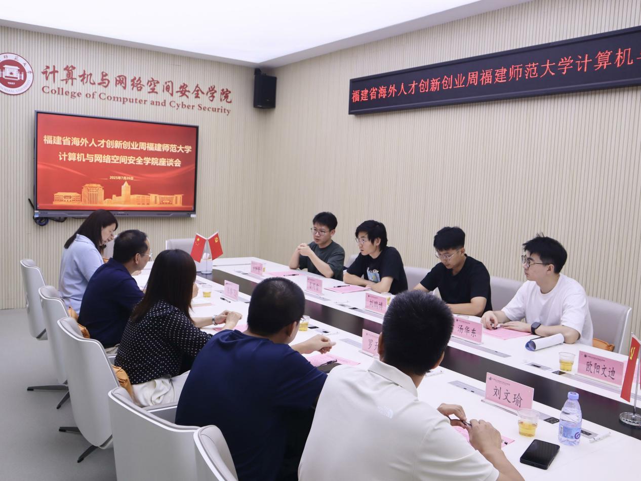 近日,参加2025年福建省海外人才创新创业周活动的4位海外优秀青年人才莅临计算机与网络空间安全学院参观交流。学院党委书记许建萍、副院长陈黎飞,相关教师代表、经办人员等参与交流。