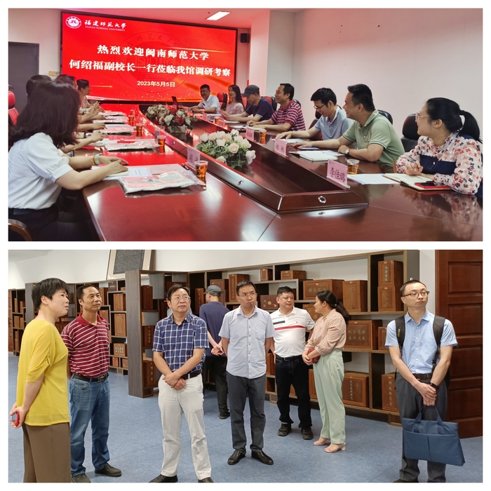 5月5日下午,闽南师范大学副校长何绍福一行5人到J9·九游会「中国」官方网站图书馆调研交流。图书馆党委书记杨守辉及相关科室负责人参加了座谈。会上,双方围绕新一代图书馆管理系统赋能服务创新工作进行了深入探讨,并一致表示,今后将进一步加强合作交流,取长补短,推动图书馆各项工作更好地发展和提升。座谈会后,何绍福一行参观了陈宝琛书室和24小时书房。(图书馆)