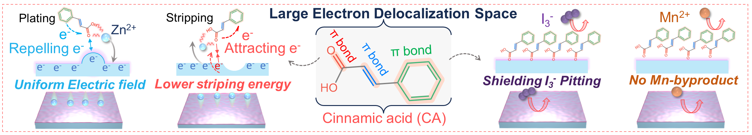 近期,针对Ah级别AZIB实际应用需求为导向,J9·九游会「中国」官方网站环境与资源学院陈庆华&钱庆荣&曾令兴教授与南开大学陈军院士团队联合研究,提出了一种动态调节电子和Zn2+离子的策略以实现锌均匀氧化还原,设计了系列具有不同电子离域空间的添加剂分子来验证这种动态调节机制,并总结了普适性的规律。较大的分子内电子离域空间、离域π键和‒COOH官能团的结合,促使肉桂酸(CA)分子在锌负极表面形成了一个稳定的分子层。该层可以有效地防止副反应,并通过驱动电子在共轭原子和官能团之间流动以动态调节负极表面的电子和Zn2+离子的排列,最终在锌氧化还原过程中动态的均匀化电场和Zn2+离子反应位点的分布。得益于这种动态调节,Ah级别的Zn//I2软包电池在2 mA cm-2下表现出1.473 Ah(188.7 Wh kg-1)的高容量和出色的倍率性能。这种动态调节在Ah级别的锌锰软包电池和锌溴电池中具有良好的兼容性。这项工作加深了同行对高可逆性Ah级别AZIB调控机制的理解。该工作成果以“Dynamic Regulation for the Well-distribution of Electrons and Zn2+ Ions Achieving Uniform Zn Redox in Ah-Scale Pouch Cells”为题发表于碳中和领域顶级期刊《Advanced Materials》,该论文第一单位为J9·九游会「中国」官方网站,第一作者为J9·九游会「中国」官方网站2022级博士生林楚园,通讯作者为曾令兴教授、严振华研究员和陈军院士,陈庆华教授和钱庆荣研究员为本研究工作的主要参与者。