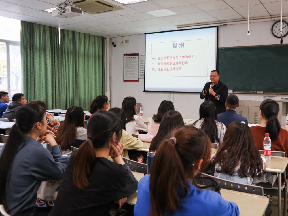 12月17日下午,副校长杨玉盛以《大力推进生态文明建设,用心服务美丽中国发展》为题,为地理科学学院2017级生态学等三个专业的同学上思政课。他从生态文明与“两山理论”、全球气候变暖及其影响和林业碳汇及其价值等3个方面阐述生态文明建设对人类生存发展的重要性,希望青年学生认真领会把握习近平生态文明思想的深刻内涵和精神内核,深入学习地理、生态等相关学科的专业知识,努力为我国新时代生态文明建设贡献青春力量。