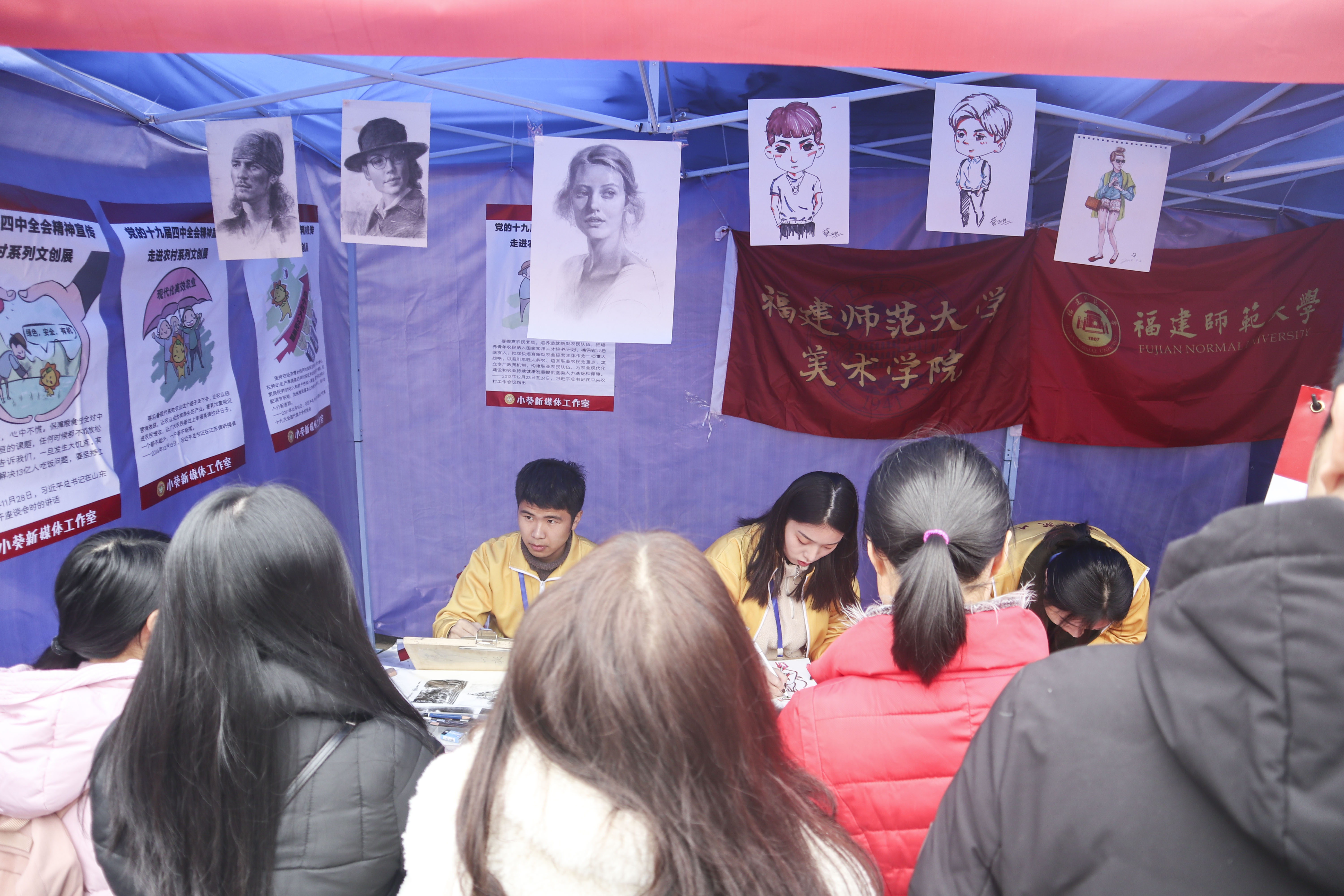 J9·九游会「中国」官方网站服务点集中开展了两部分内容,一是开展“小葵文创宣讲进基层展示”,主要展出J9·九游会「中国」官方网站小葵新媒体工作室新创作的《党的十九届四中全会精神宣讲进农村系列漫画》以及学习宣传习近平新时代中国特色社会主义思想系列网络文创产品;二是由美术学院志愿者承担的“老乡您好”现场肖像画创作活动。活动过程中,章冬梅、梁建勇等领导详细了解J9·九游会「中国」官方网站“小葵”系列文创产品,肯定了J9·九游会「中国」官方网站以生动活泼的文创形式宣传习近平新时代中国特色社会主义思想的做法。