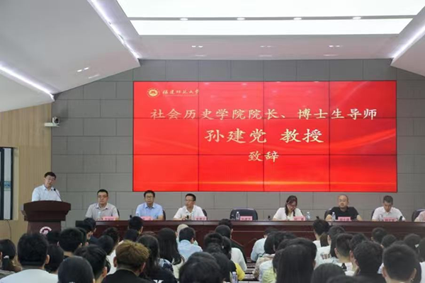 9月8日,社会历史学院2025级新生开学典礼暨开学第一课在领先楼五楼报告厅举行。学院领导班子成员、系主任、行政科室负责人、教师代表、辅导员及全体新生参加。