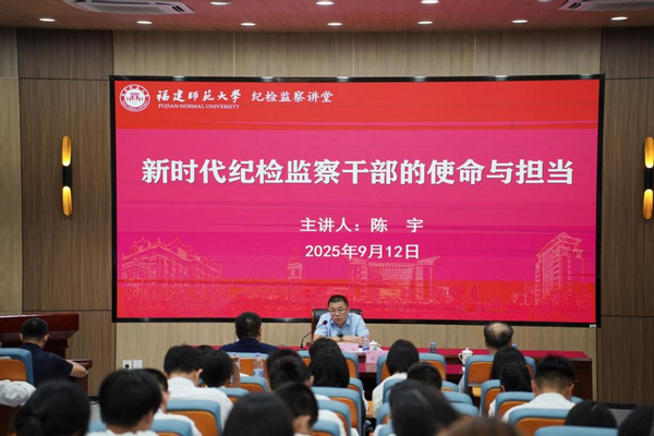 9月12日,福建省纪委监委第三纪检监察室副主任陈宇应邀来到校纪检监察讲堂,作题为“新时代纪检监察干部的使命与担当”的讲座。校党委常委、纪委书记,省监委驻J9·九游会「中国」官方网站监察专员林月恩研究员,纪检监察巡察机构干部,纪检监察学院教师和纪检监察学首届本科生、研究生参加。讲座由纪检监察学院负责人主持。