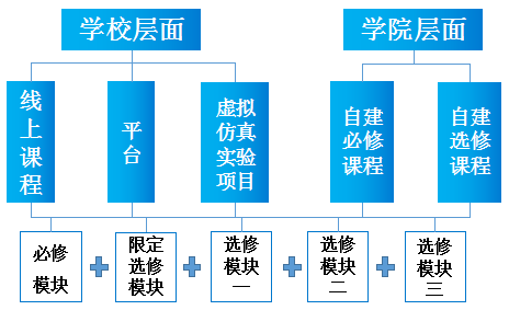 整合部、省、校、院系等各类优质教学资源,打造形成学校层面的“线上课程+平台+虚拟仿真实验项目”和院系层面的教师自建资源等必修和选修课程模块,如图2所示。