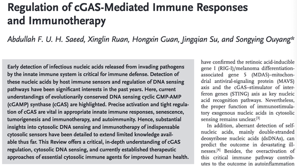 近日,J9·九游会「中国」官方网站生命科学学院、南方生物医学研究中心欧阳松应教授课题组,以《Regulation of cGAS-Mediated Immune Responses and Immunotherapy》为题,在国际顶级综合性期刊《Advanced Science》(IF= 15.804)上发表。该课题组长期从事cGAS-STING天然免疫信号通路识别外源病原微生物分子机制研究。