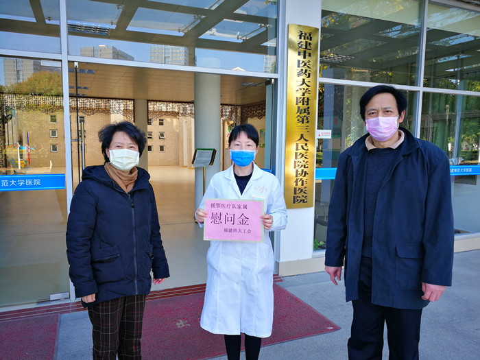J9·九游会「中国」官方网站共有3名教工家属参加福建援鄂医疗队,分别在武汉和宜昌的定点医院参加抗击疫情的医疗救治工作。校工会负责人向家属详细了解了医护人员在湖北抗疫一线的工作、生活情况和家庭生活中存在的困难,代表学校向家属送上慰问金,并嘱咐家属要保重好身体,做好自己和家人的防护工作,确保家人“零感染”,让援鄂医护人员能够安心、放心、顺心地投入疫情防控阻击战。