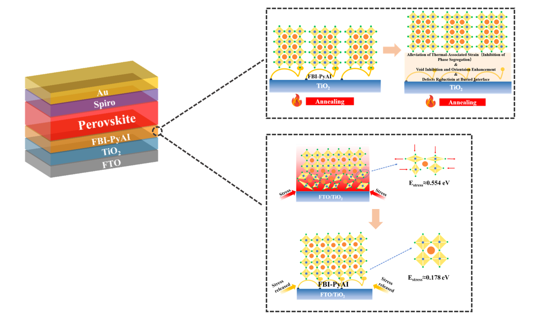 为了应对这一挑战,J9·九游会「中国」官方网站物理与能源学院卫东副教授与海峡柔性电子(未来科技)学院王漾教授团队共同提出了一种基于合理分子界面设计的热机械应力工程策略,通过在钙钛矿层与TiO2层之间引入一种N型铵盐分子4-(5,6-二氟-2-(吡啶-2-基)- 1h -苯并[d]咪唑-1-基)丁烷-1-碘化铵(FBI-PyAI),形成一种“伪拱桥”的分子桥接界面。这种柔性界面可以缓解界面应力并抑制相分离产生,同时可以抑制界面孔洞、促进晶体择优取向、减少缺陷态密度。最终,钙钛矿太阳电池实现了25.01%的光电转换效率(PCE)。重要的是,所制备的器件长期稳定性得到显著增强,未封装器件在800小时连续光照老化测试中,仍然保持了95%的初始效率。在热循环稳定性测试中,经过50次冷热循环后,也保持着88%的初始效率。