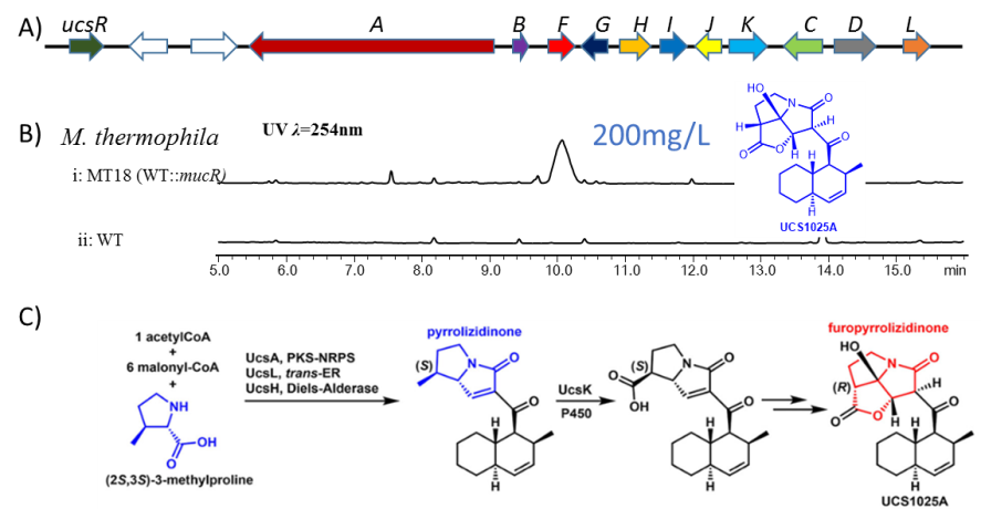 寻找天然活性产物一直是药物开发的重要研究领域,李力等人利用基因组挖掘(Genome Mining)技术,从一株嗜热毁丝霉菌Myceliophthora thermophila中发现了一个新型复杂三并杂环结构且具有强烈抗肿瘤活性(通过抑制端粒酶活性)的天然产物UCS1025A,在遗传学、生物化学两个层面揭示了UCS1025A的生物合成机制和途径,并通过基因工程技术实现了UCS1025A在异源宿主中的高效表达。