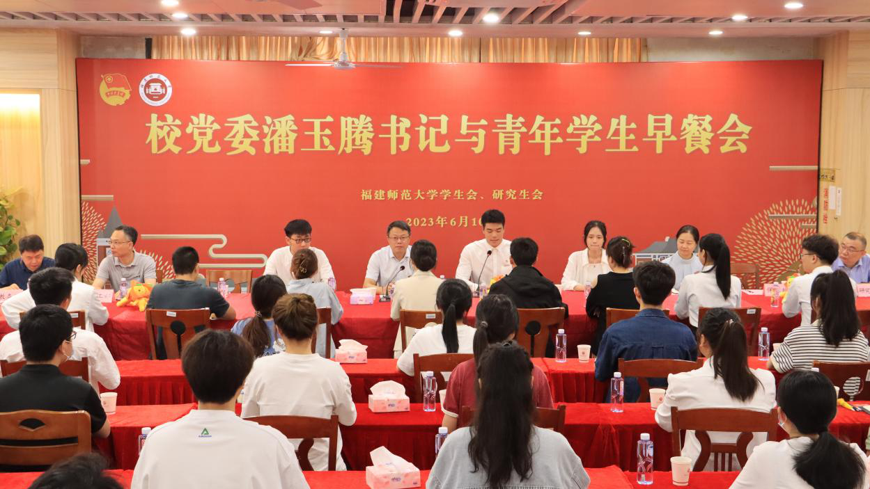 6月10日,由校学生会、研究生会主办的第十七期“校党委书记与青年学生早餐会”在仓山校区聚星园餐厅举行。校党委书记潘玉腾,党政办公室、宣传部、学生工作部、保卫处、教务处、研究生院、后勤管理处、校团委、体育科学学院等单位负责人、各学院学生代表参加活动。早餐会由校学生会执行主席林润杰主持。
