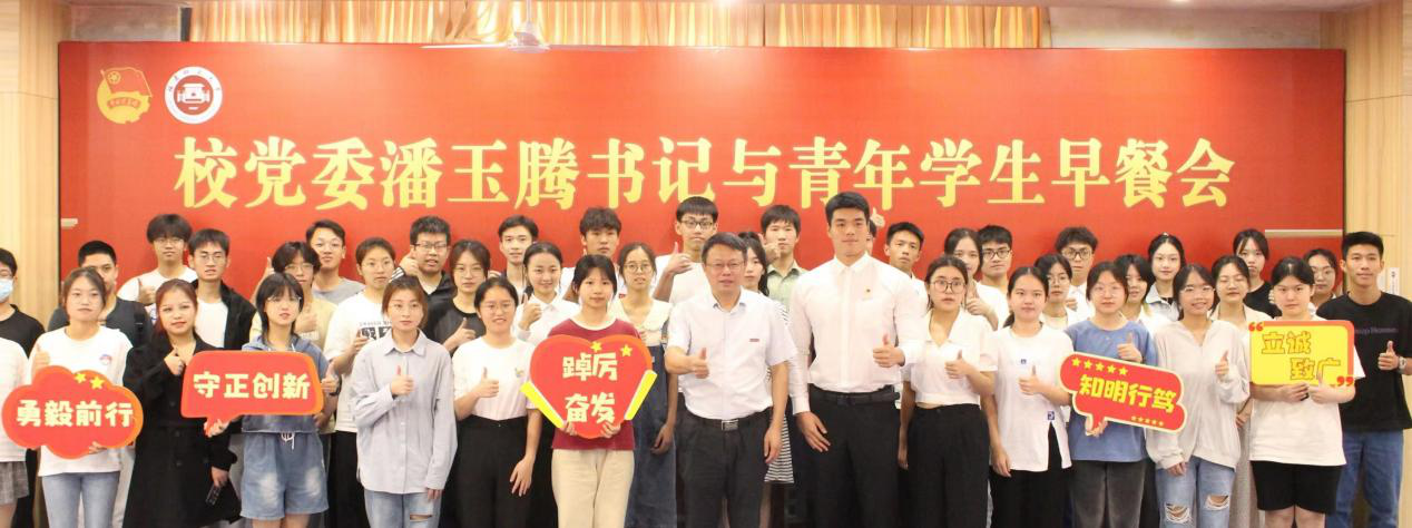 潘玉腾对学生代表提出的问题进行了耐心细致的解答,他表示,早餐会为同学们参与学校民主管理提供了良好载体,希望大家畅所欲言,积极为学校改革发展建言献策。在与学生畅谈中,潘玉腾叮嘱同学们要当“自找苦吃”的实干家,不做“客里空”,珍惜大学时光,练就过硬本领,自觉扛起新时代新征程的使命担当;要积极参与社会实践和调查研究,了解社会、开阔视野,砥砺品格、增长才干,在社会实践大课堂中历练成长;师范生要更加严格要求自己,全面提升自身素质,努力成为党和人民满意的“四有”好老师。同时,他寄语毕业班同学“扬帆筑梦,奋楫争先”,始终保持昂扬向上的精神状态,充满自信地走向社会,为实现中华民族伟大复兴中国梦贡献青春力量。