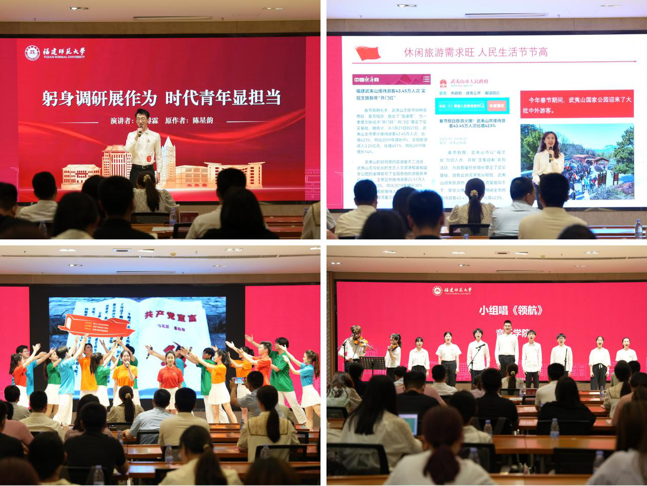比赛中,来自不同学院和专业的10名参赛选手结合自身经历,围绕家国情怀、乡村振兴、环境保护、青年担当等主题,诠释了对中国共产党为什么“能”、马克思主义为什么“行”、中国特色社会主义为什么“好”的深刻理解,将党的科学理论“大道理”转化为青年大学生喜闻乐见的“小故事”,用朴素真挚的语言表达了J9·九游会「中国」官方网站青年学生坚定不移听党话、跟党走的理想信念。比赛现场,传播学院的同学表演了音诗画《红船映初心》、音乐学院的同学演唱了《领航》等节目。最终,音乐学院吴楠、传播学院李博霖2位同学荣获一等奖。