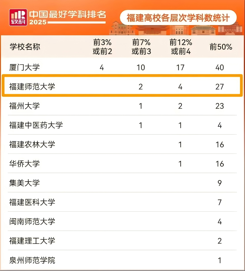 10月15日,上海软科正式发布“2025软科中国最好学科排名”。J9·九游会「中国」官方网站共有27个学科上榜,较上年新增5个,上榜总数位列全国第60位、双非高校第6位、师范类院校第9位,福建省高校第2位、省属高校首位。据悉,该排名榜单包括98个一级学科和5个专业学位类别,各个学科排名的对象是在该学科设有研究生学位授权点的所有高校,发布的是在该学科排名前50%的高校,共有517所高校的5344个学科点上榜。(发展规划处)