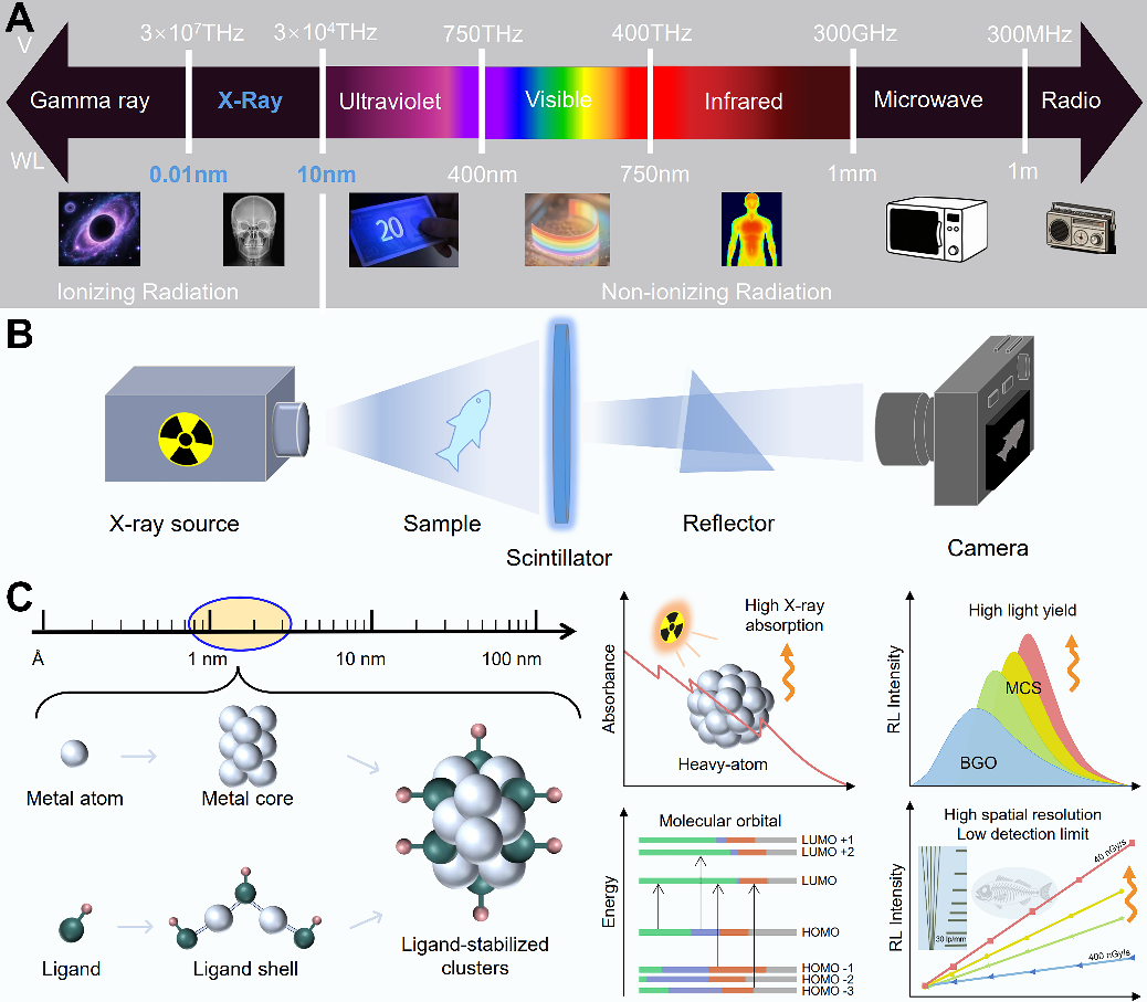 基于闪烁体的X射线探测技术在医疗诊断和工业检测等多个领域发挥着关键作用。近年来,金属团簇作为一种新型闪烁体材料,因其优异的X射线吸收能力、可调的光学性质和良好的水氧稳定性等优势,在X射线成像领域展现出令人振奋的前景。