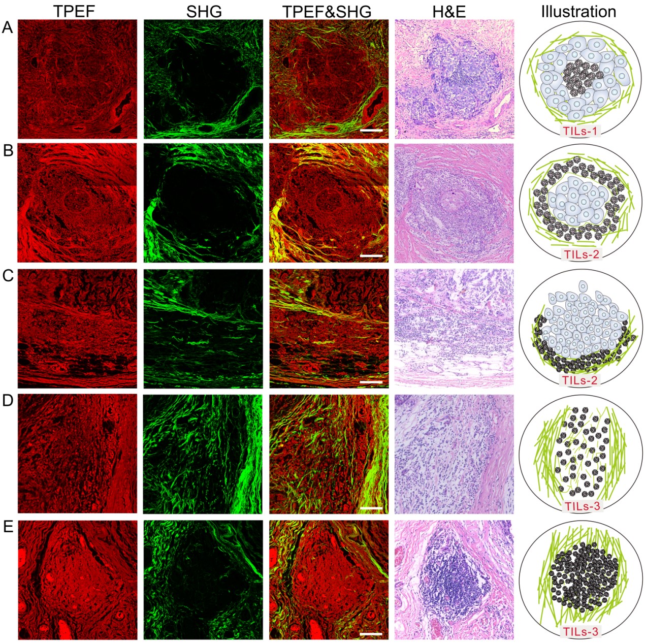 本研究中,课题组首先采用多光子显微镜(MPM)对564例乳腺癌患者肿瘤微环境中的肿瘤浸润淋巴细胞(TILs)进行成像,进而根据TILs与肿瘤细胞、胶原纤维的相对位置将TILs重新定义为TILs1-3,并基于TILs1-3的表达频率,提出一种评估TILs预后价值的新方法,结合岭回归分析给出每个患者的肿瘤浸润性淋巴细胞评分(TILs-score)。医学统计分析结果表明,TILs-score是乳腺癌患者无病生存期(DFS)和总体生存期(OS)的独立预后因子,并且对ER阳性乳腺癌患者具有更强的预后价值。在ER阳性乳腺癌患者中,将TILs-score与临床独立因子结合可将训练组5年DFS(OS)的AUC提高至0.814(0.830),HR提高至4.643(7.006),将验证组5年DFS(OS)的AUC提高至0.804(0.830),HR提高至3.729(5.132)。
