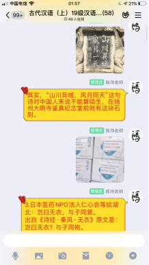 四是做好课程思政。课程门门讲思政,教师人人皆育人,深入推进思政课程和课程思政,特别是结合贯彻落实习近平总书记关于疫情防控工作重要讲话和重要指示批示精神,深入挖掘疫情防控时涌现出的先进典型感人事迹,将其作为最鲜活的教材,引入专业课程教学之中。中文老师结合日本捐赠物资时的寄语“山川异域、风月同天”“与子同袍、岂曰无衣”,阐释推动构建人类命运共同体的伟大意义。舞蹈老师让学生创作动物形象的即兴舞蹈,引导学生热爱自然、关爱动物。物理老师讲到万有引力时绘制“智慧天梯”,勉励学生培养学习前人成果、继续探索创新、勇于追求真理的科学精神。信息技术老师结合疫情期间谣言起伏的现状,精心设计研讨话题,提升学生的信息素养。此外,有的老师结合课程教学,布置学生选题设计防疫期间中小企业扶持政策需求调查、城市居民生活条件保障调查,引导学生关注民生社会、涵养家国情怀;有的老师献身说法,讲述自己作为大学生感受全国上下众志成城抗击“非典”的心路历程,引导学生思考时代对青年学生的呼唤、国家对青年学生的期待。