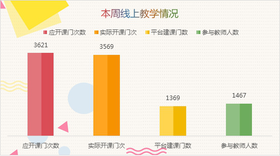 2月17日,学校按照原定校历以线上教学形式如期开课,本学期全校本科应开课程1446门。第一周,开课1236门,占本学期应开课程总数的85%;第二周开课增加到1273门,占88%;第三周,开课增加到1355门,占94%;第四周,开课增加到1369门,占95%。目前,除77门课程因场地受限、保密需要、特殊困难等原因无法开展线上教学外,其他课程均已按照教学执行计划开展线上教学活动。开课一个月以来,教师周线上开课最多达到3569门次,学生周线上修读最高达到445972人次,参与教师共计1467人。