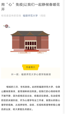 三是开展心理疏导。包括由心理学院叶一舵教授撰文向全校师生提出疫情期间保持积极健康心态的有关建议,学校官微推送《用心免“疫”——假期延长,大学生如何合理安排时间》,校团委、心理学院指导“小葵”防疫心理志愿服务队面向宜昌开通义务心理支持热线等。