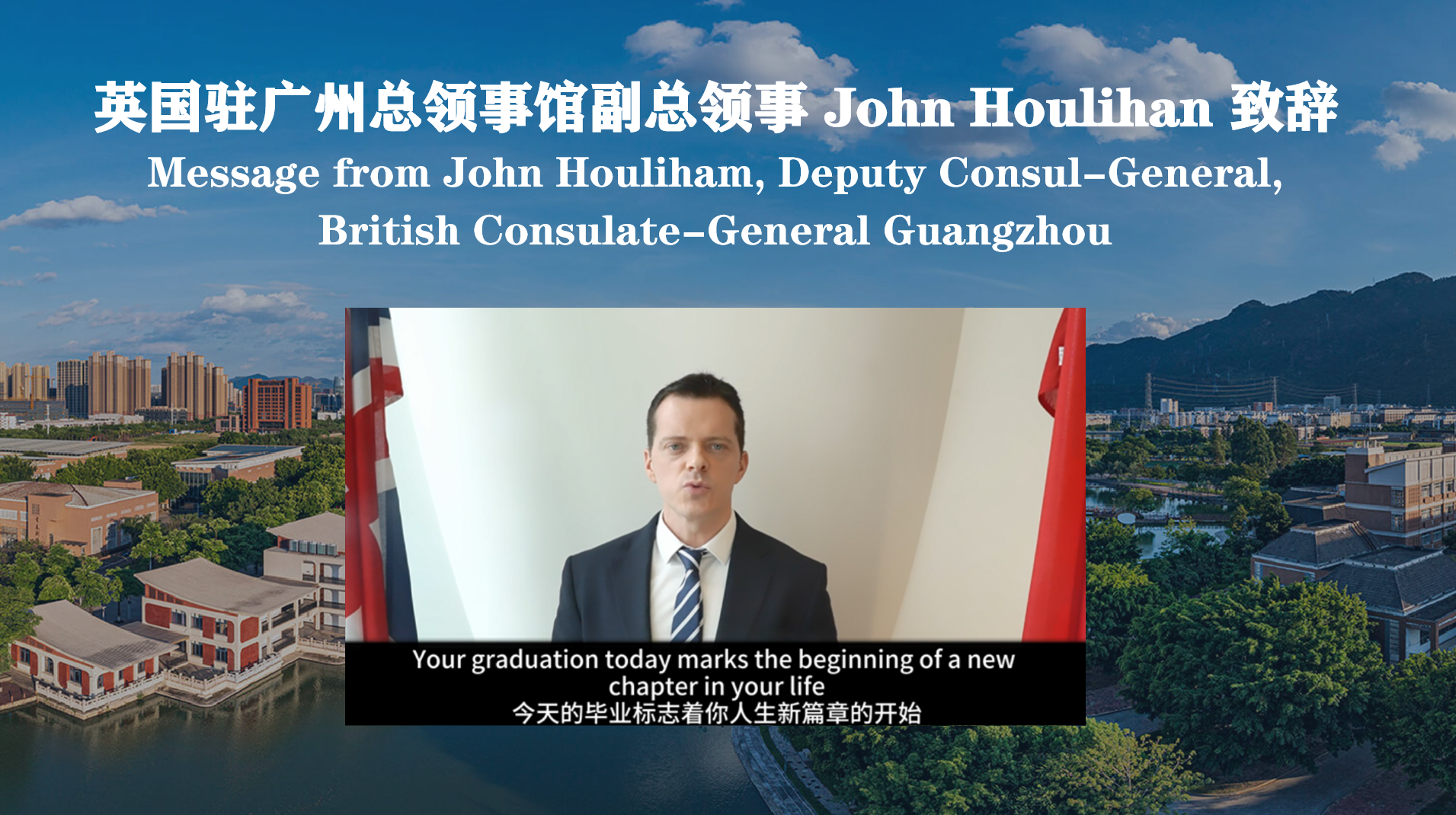 英国驻广州总领事馆副总领事John Houlihan侯礼瀚先生在视频致辞中肯定了两校在高等教育领域取得的合作成果,感谢双方为中英双边友好关系所作出的努力。