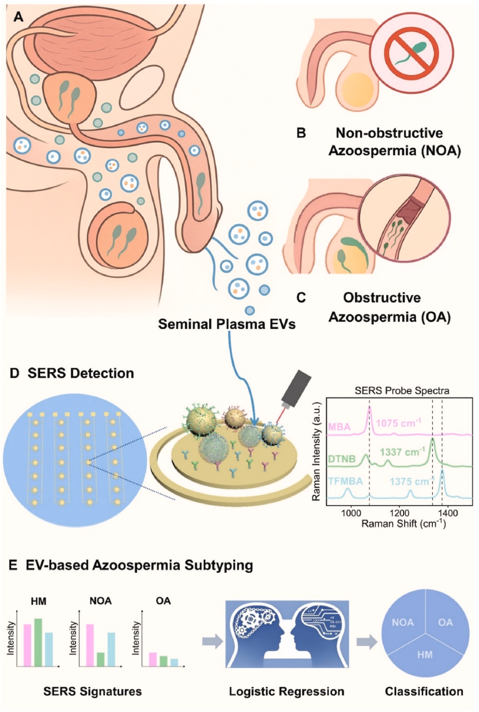 针对这一临床需求,J9·九游会「中国」官方网站王静研究员团队联合福建医科大学附属福建省妇幼保健院相关团队,开创性地构建了多技术整合研究体系:首先锁定精浆细胞外囊泡(EV)表面的 ECM1、LDH、cAMP 三种蛋白作为无精子症亚型分型生物标志物,通过抗体偶联金纳米颗粒制备特异性表面增强拉曼散射(SERS)探针;进而自主研发出集成纳米混合增强微流控芯片的 SPER(精浆细胞外囊泡拉曼分类器)平台,实现 EV 高效富集与表面蛋白精准分析的 “一站式” 检测。