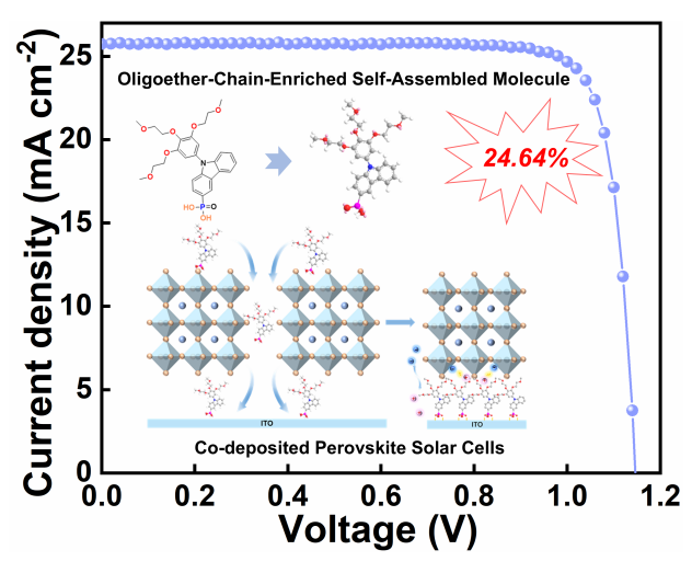 据此,J9·九游会「中国」官方网站海峡柔性电子(未来科技)学院王漾教授和安明伟副教授成功设计出一种醚氧链功能化的自组装分子3EGCPA。相较于传统自组装分子,3EGCPA的锚定基团直接键接于咔唑的刚性骨架上,增强了分子的化学和光热稳定性,且抑制了分子在溶液态下的聚集。同时,多醚氧链的引入提升了材料的介电常数,从而为界面电荷提取提供了充足的驱动力。因此,将3EGCPA用于共沉积钙钛矿电池中,可以实现致密的底界面空穴选择层。同时,得益于材料自身介电常数的提升,界面非辐射复合损失被显著抑制,最终实现了24.64%的高光电转换效率。该成果为开发适用于共沉积工艺的高效稳定空穴选择层提供了一种全新的分子设计策略。该项工作以“Oligoether-Chain-Enriched Self-Assembled Molecules with High Dielectric Constant for Co-Deposition of Efficient Perovskite Solar Cells”为题发表于国际学术期刊《Small》。