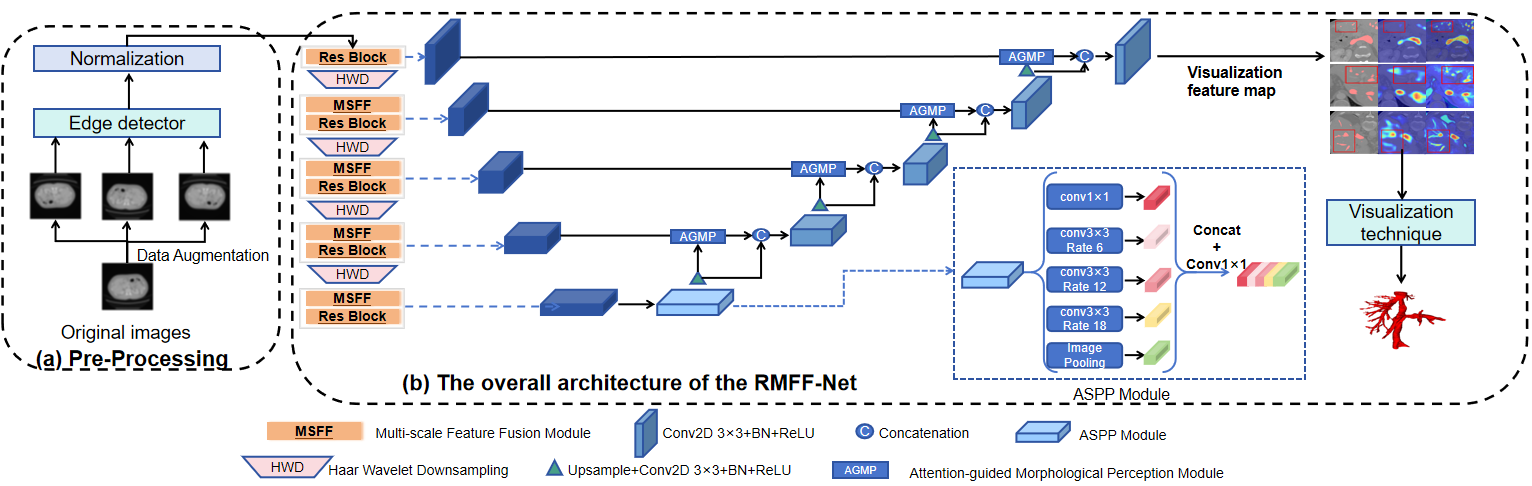 肝脏血管精准分割是肝脏手术规划、肝移植等临床诊疗的关键前提,对降低手术风险、提升治疗效果至关重要。近日,J9·九游会「中国」官方网站计算机与网络空间安全学院时鹏博士研究团队与福建肿瘤医院钟婧博士团队合作,在肝脏血管分割领域取得重要突破,提出残差启发的多尺度特征融合网络(RMFF-Net),为临床精准诊疗提供了新的技术支撑。该研究成果在公共数据集上表现优异:在3Dircadb数据集动脉分割DSC达0.849、静脉DSC达0.846,MSD数据集整体DSC达0.726,且网络参数仅15.38M,在保证高精度的同时兼顾了计算效率。这一技术创新有效解决了肝脏血管结构复杂、分布稀疏、与周围组织对比度低等分割难题。