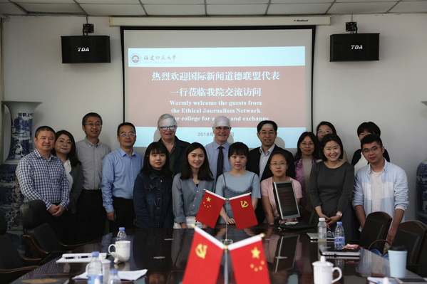 近日,国际新闻道德联盟代表艾登·怀特(Aidan Patrick White)主任和伯恩特·奥鲁佛森(Bernt Olufsen)理事在中国记协国际部副部长陈涛、国际台记者费菲、省记协副主席曾武华、省记协副秘书长俞增辉的陪同下到校访问交流。校党委副书记叶燊会见访客,宣传部、国际处、校团委、传播学院等相关单位负责人参加了有关活动。