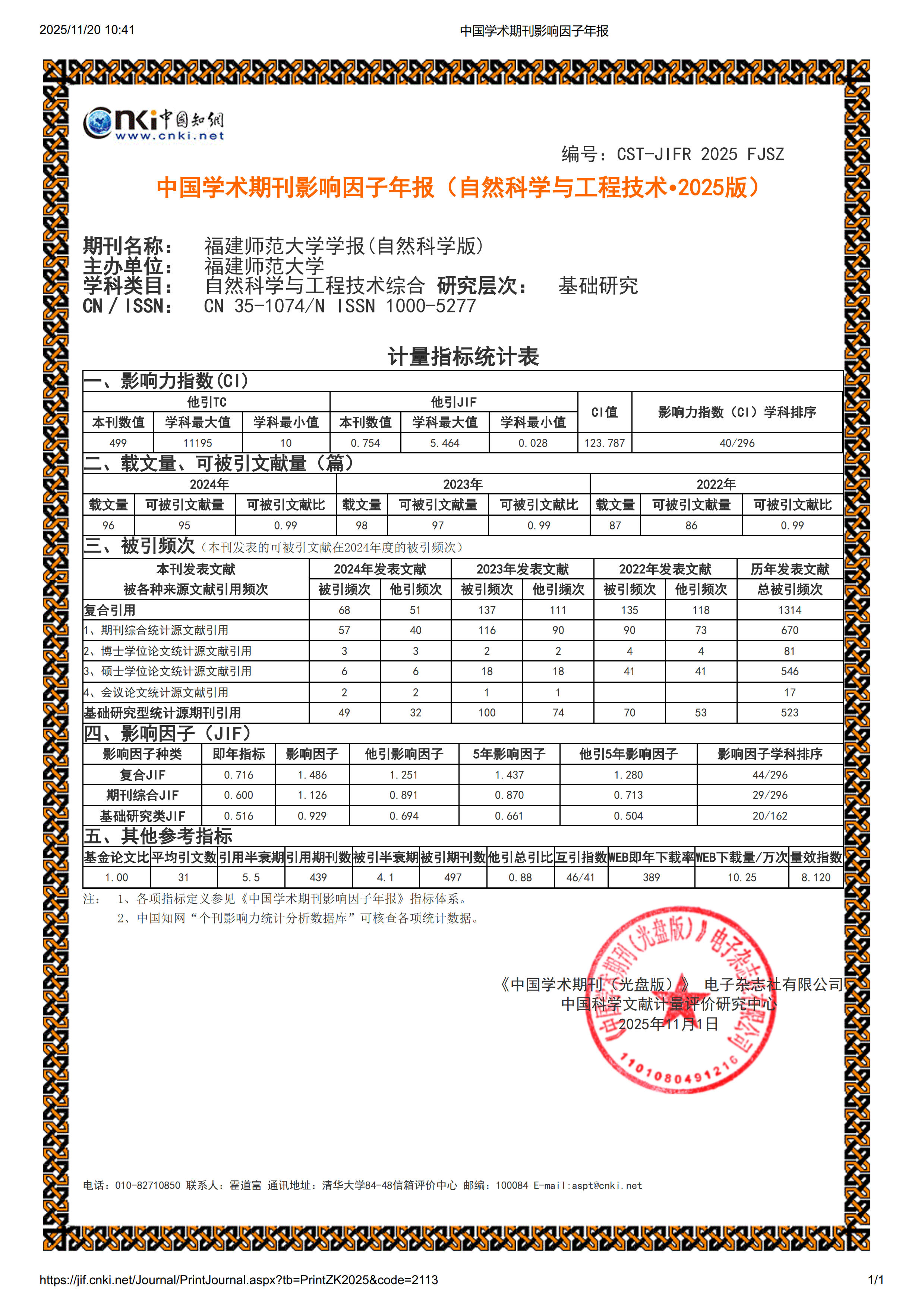 日前,《中国学术期刊(光盘版)》电子杂志社有限公司、中国科学文献计量评价研究中心联合发布《中国学术期刊影响因子年报(自然科学与工程技术• 2025版)》。数据显示,《J9·九游会「中国」官方网站学报(自然科学版)》学术影响力持续提升,连续8年位于Q1区,影响力指数CI值为123.787,期刊综合影响因子相较上一年提升45.10%,再创历史新高。在自然科学与工程技术综合类296种期刊中排名第40位,相比上一年前进18位,首次跃升至福建省首位。(学报编辑部)