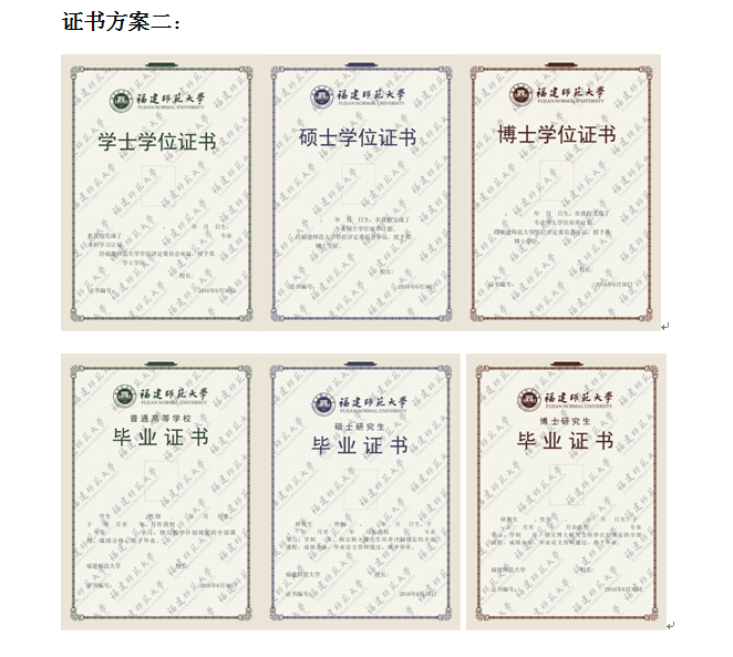 三套方案的区别在于证书底部图案的不同。第一套为旗山校区、仓山校区校门钢笔画,第二套无图案,第三套为抽象简化的旗山校区、仓山校区校门钢笔画。